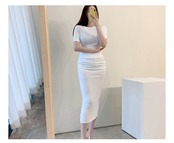 ボディサイドのシャーリングゴムがポイントのデザインで、女性らしい印象のタイトロングワンピース。