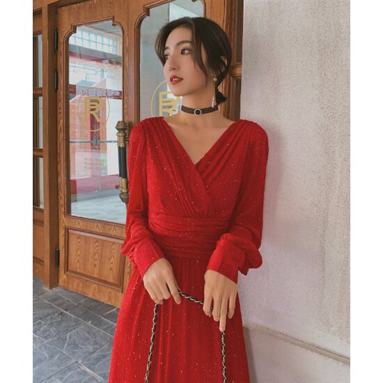 ロングワンピース 長袖 Vネック ロングスカート ハイウエスト プリーツ お呼ばれ 結婚式ドレス 演奏会ドレス きれいめ エレガント ロング丈 Aラインスカート レディースワンピース シンプル お洒落
