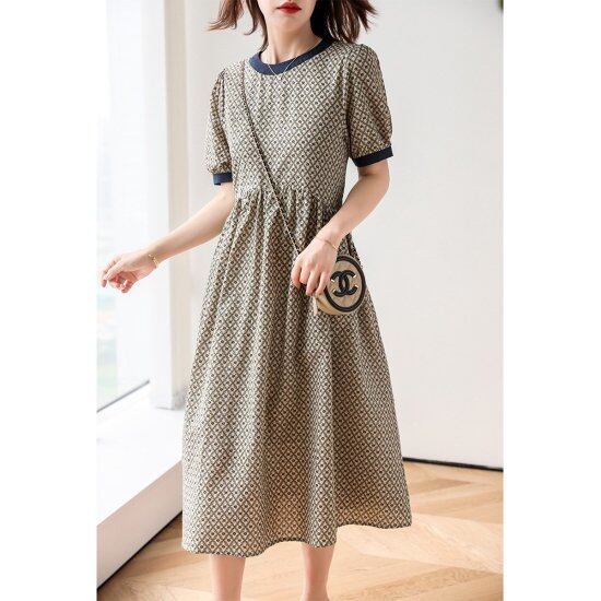 花柄ワンピース レディースワンピース 春夏ワンピース Aライン ウエストマーク おしゃれ 大人可愛い 膝下丈 リボン 大人女子 ラウンドネック パフスリーブ ロング丈 ハイウェスト 五分袖 きれいめ