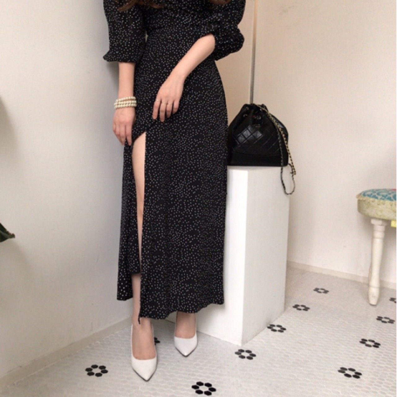 細かいドット柄のロング丈ワンピース。