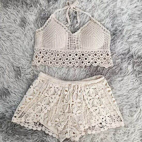 かぎ針編み特有の透け感が大人可愛いペプラムフレアデザインビキニ。