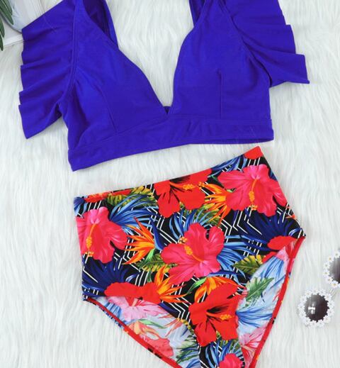 水着 レディース ビキニ セクシー Vネック フリル ハイウエスト 花柄 スイムウェア 夏新作 夏 海 大きいサイズ 体型カバー 20代 30代 大人 2点セット 水着 レディース ビキニ セクシー