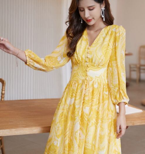 鮮やかなイエローが印象的なマキシ丈ワンピースです♪