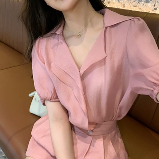 ツーピース レディース シフォン パフスリーブ フレアパンツ ミニ丈 上下 五分袖 ショートパンツ 無地 襟付き ツーピース レディース シフォン パフスリーブ フレアパンツ ミニ丈 上下