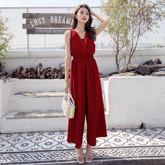 サロペット ロンパース サロペットパンツ ワイドパンツ ノースリーブ Vネック ウエスト切り替え カシュクール バッグリボン 無地 夏物 リゾート リラックス 大人 上品 かわいい おしゃれ