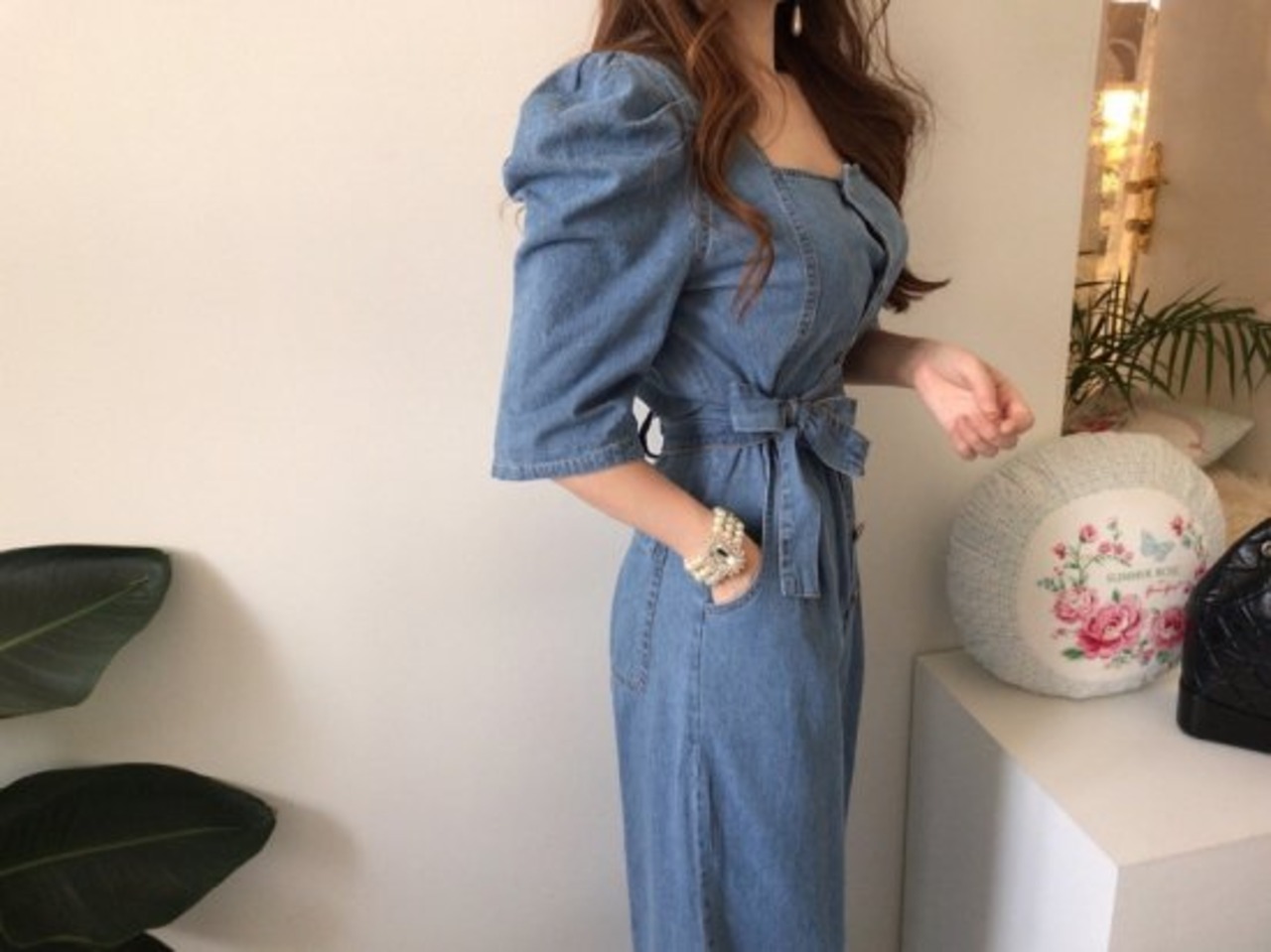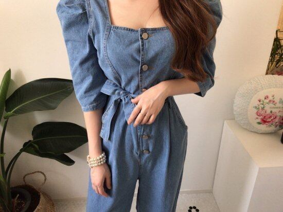 オールインワン ジャンプスーツ レディース レディース デニム ボタン カジュアル 大人 シンプル ガーリー 休日 大人かわいい 春 夏 秋 冬 トレンド スクエアネック 5分袖 ハイウエスト