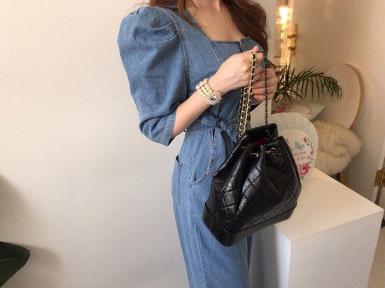 スクエアネックにハイウエストの女性らしく着こなせるオールインワン。