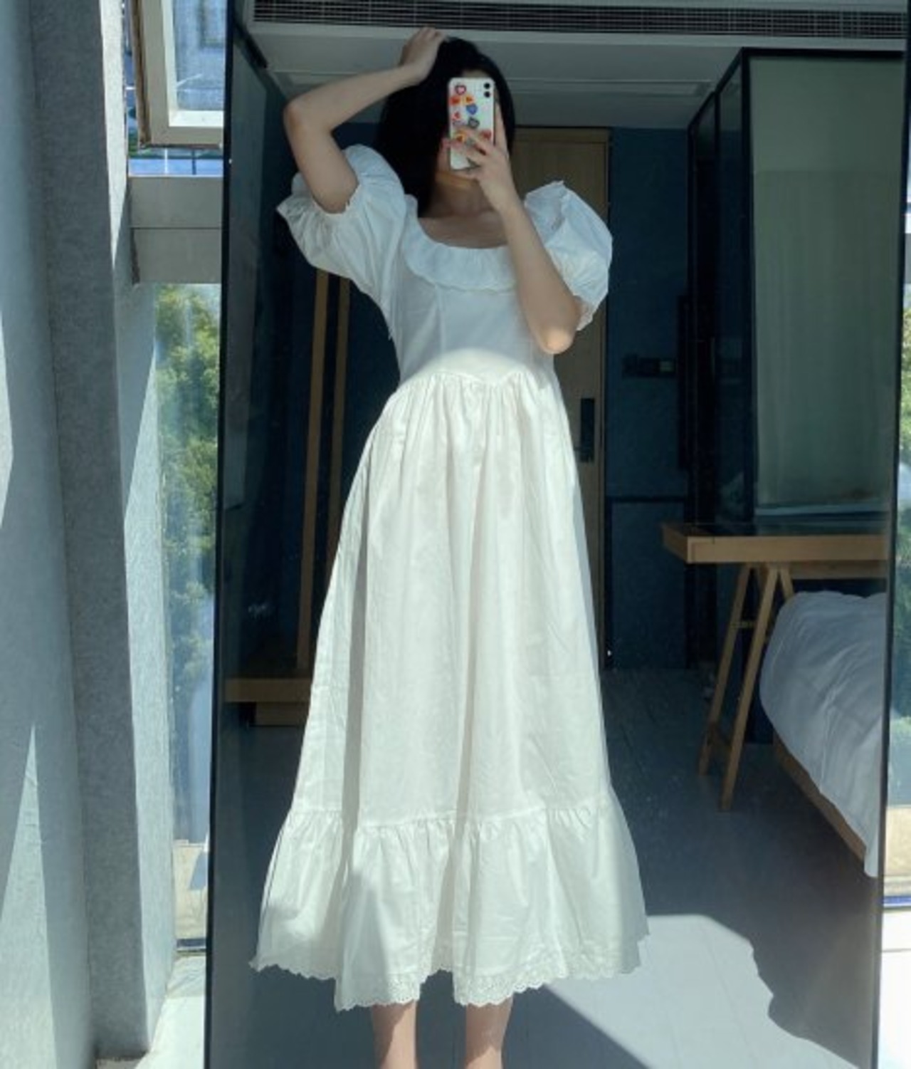 ふんわりとした袖や、襟や裾に施されたレースがかわいらしいデザイン。