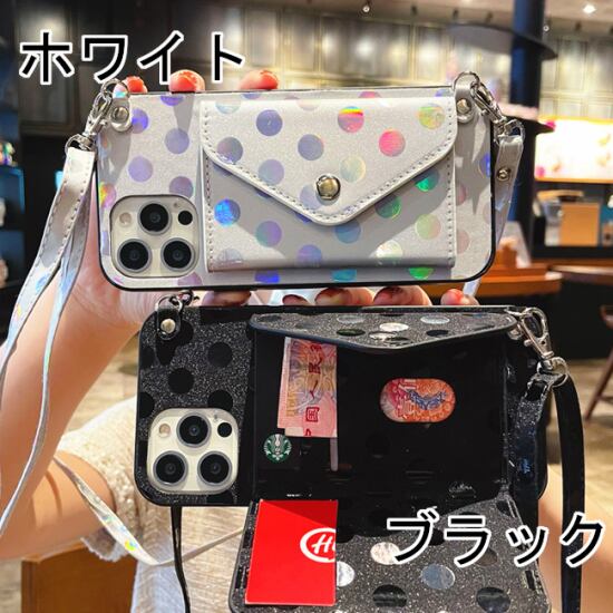 iphone ケース レディース 水玉 ドット ブラック ホワイト ショルダーストラップ カード入れ シリコン 可愛い 保護ケース Phone13 iPhone12 iPhone11 iPhone X