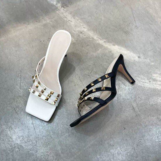 サンダル 斜線ストラップ スタッズ ミュールサンダル ピンヒール レディース 夏 履きやすい 歩きやすい 新生活 人気 ヒール スクエアトゥ ハイヒール セクシー モノトーン 個性的