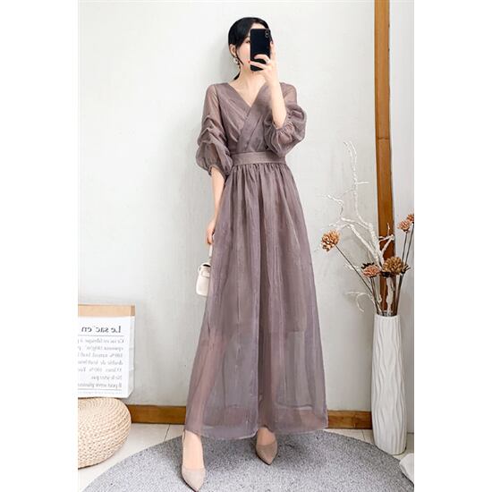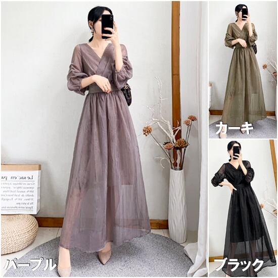 フレアワンピース 大きいサイズ XL 2XL ランタンスリーブ ハイウエスト Aラインスカート ロングスカート 無地 膝丈スカート 体型カバー 上品 きれいめ お呼ばれ Vネック カジュアルドレス