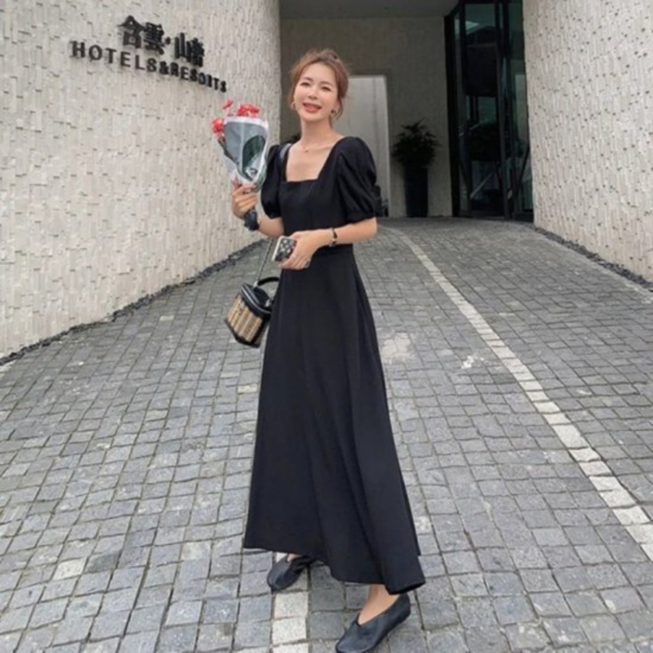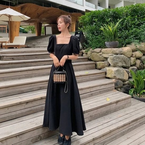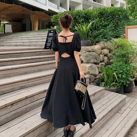 ワンピース バックシャン レディース 韓国 ファッション 黒ワンピース カットアウト バックシャン リボン フレア Aライン ロングワンピ 夏 半袖ワンピ パフショルダー 背中見せ ボリュームフレア