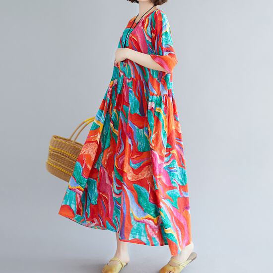 ロングワンピース レディース ラウンドネック ミモレ丈 5分袖 半袖 体型カバー ゆったり プルオーバー ロングワンピース レディース ロング丈 ラウンドネック ミモレ丈 5分袖 半袖 体型カバー