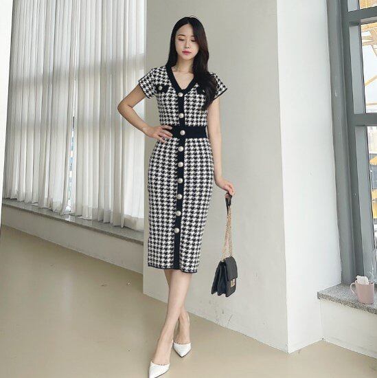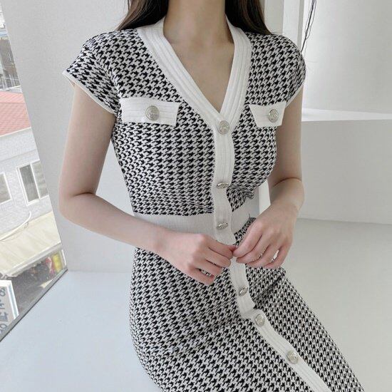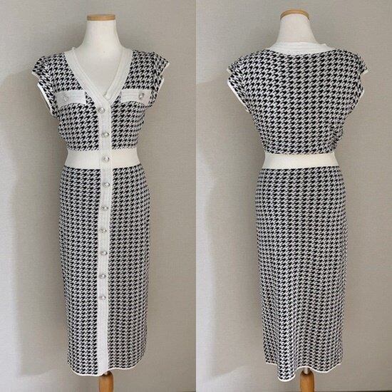 ワンピース ニット 千鳥格子 レディース 韓国 ファッション ノースリーブ フレンチスリーブ 上品 大人カジュアル ニットワンピ―ス 柄ワンピース 上品 オフィス Vネック