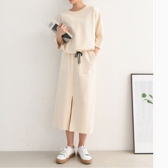 セットアップ シンプル レディース 韓国 ファッション スカート Tシャツ ポケット タイトスカート ひざ下 無地 ラウンジ おしゃれ リラックス 上下2点セット 七分袖 コットン 綿 セットアップ
