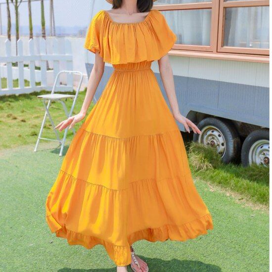 ワンピース 無地 レディース 韓国 ファッション オフショル 夏ワンピース サマードレス フリルトップ Aライン リゾートワンピチュールワンピース ロング おしゃれ 2way デコルテ ワンピース