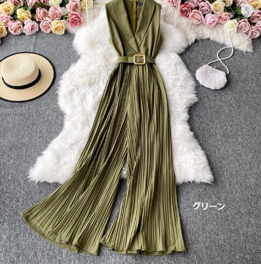 オールインワン レディース ジャンプスーツ サロペット ノースリーブ 夏秋 きれいめ 結婚式 ウエストベルト お呼ばれ 二次会 シンプル プリーツ パンツ オールインワン レディース ジャンプスーツ