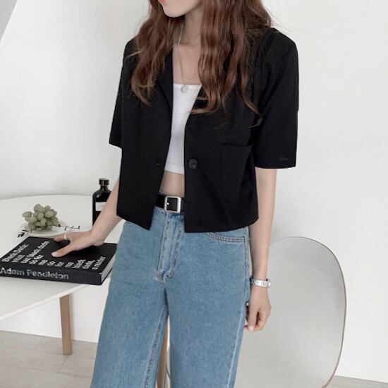 サマージャケット ショート丈 レディース カーキ ブラック 半袖 アウター 上着 薄手 夏 ワンボタンジャケット サマージャケット ショート丈 レディース カーキ ブラック 半袖 アウター 上着