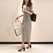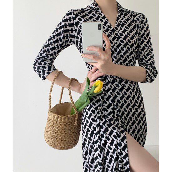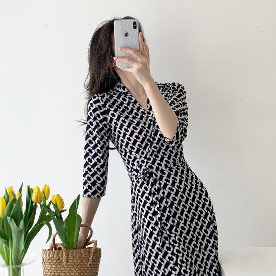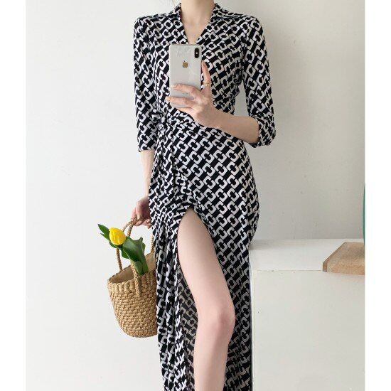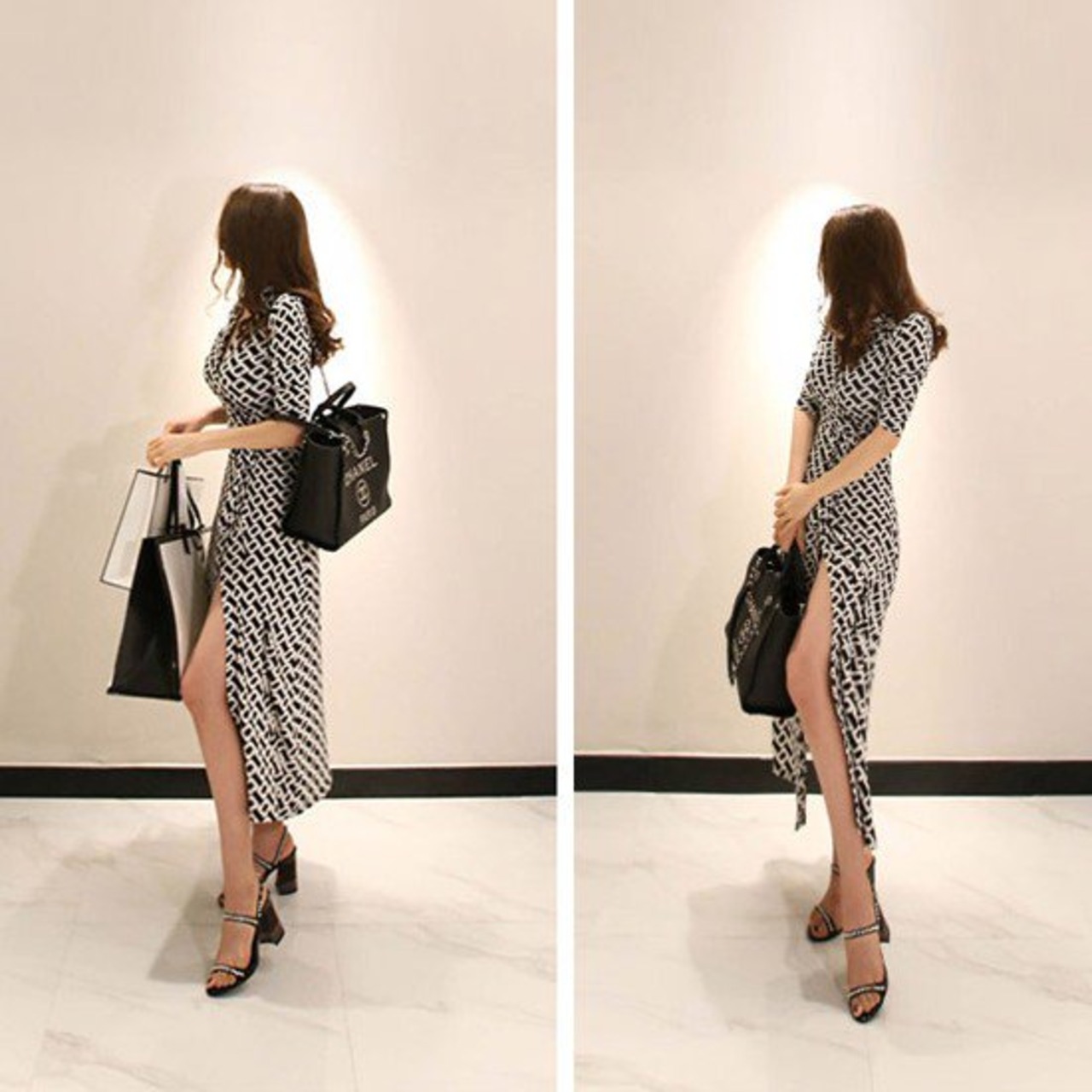 ロングワンピース 半袖 春夏 ロング Vネック チェーン柄 ロング丈 ワンピース 柄ワンピース Aライン スリット スリットワンピース サイドスリット レディース ロングワンピ 夏ワンピ 大人 夏