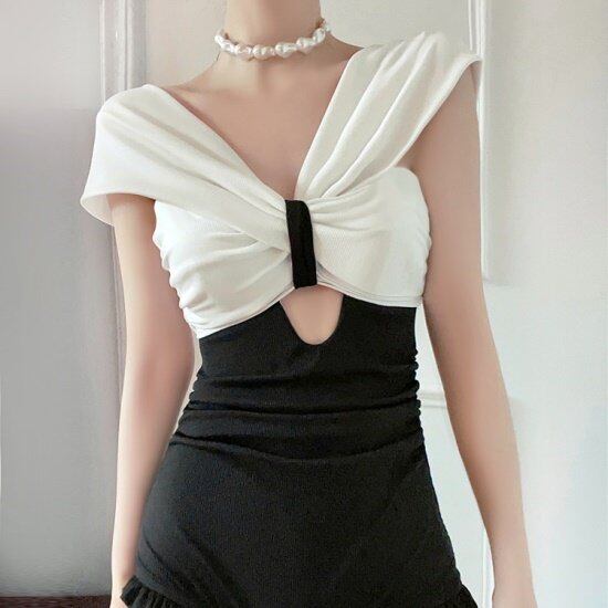 ワンピースビキニ 水着 上品 スイムウエア 白黒 ツートン モノトーン 上品 大人 ボクサー モノキニ おしゃれ かわいい Vネック ブラ ハイウエスト フリル 水着 ワンピースビキニ スイムウエア