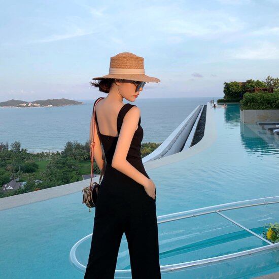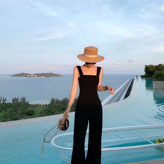エレガントなリゾートバカンスに合わせやすいオールインワンパンツ。