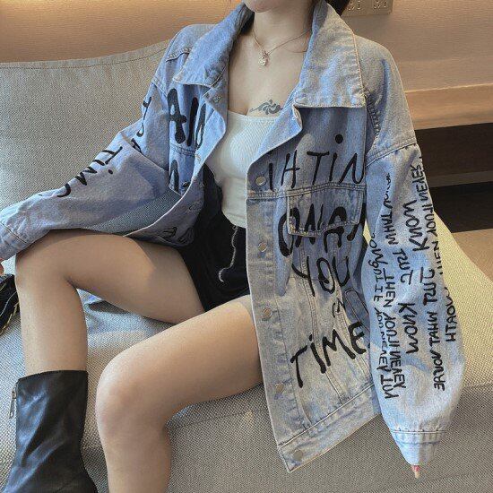 デニムジャケット 手書きロゴ レディース 韓国 ファッション ペイントロゴ 落書きジャケット デニム アウター 春秋 おしゃれ オーバーサイズ メンズライク 長袖 デニムジャケット バックシャン