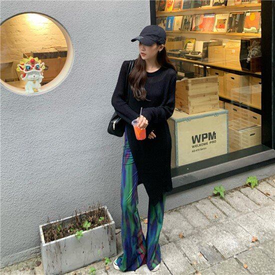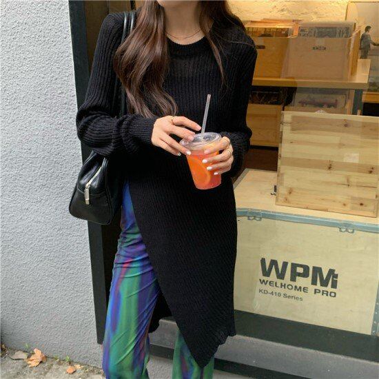 ニット ロング セーター レディース 韓国 ファッション すけ感 シアートップス ロングチュニック アシンメトリー スリット 無地 白黒 ロング セーター レディース ニット シアー シースルー 春秋