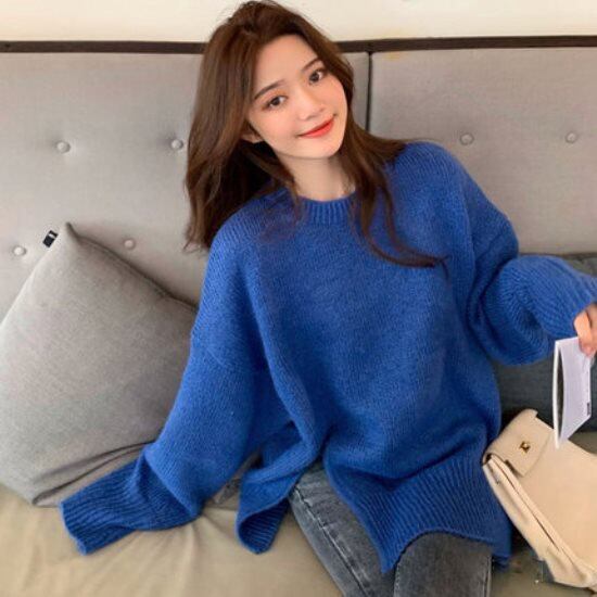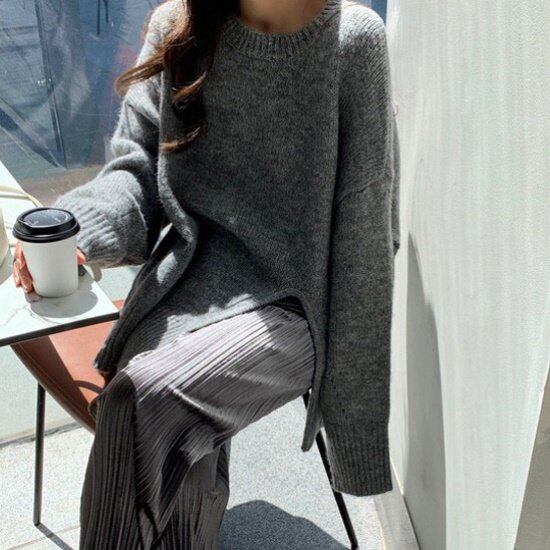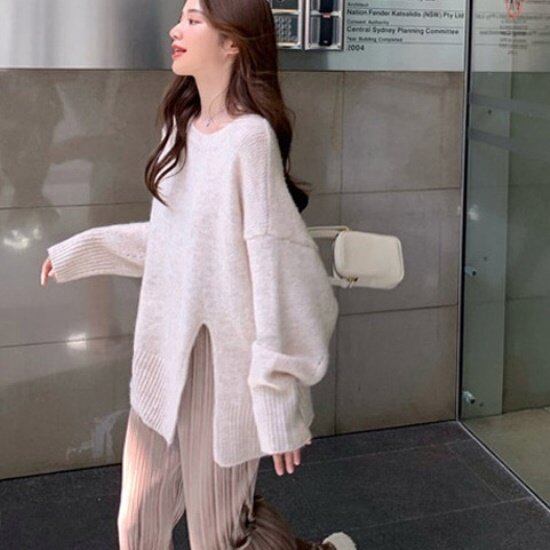 ニット クルーネック レディース 韓国 ファッション スリット 秋冬 トップス 長袖 プルオーバー シンプル ロング袖 セーター 大人カジュアル シック シンプル おしゃれ コクーンシルエット 秋冬