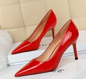 シンプルながらも足元を美しくみせてくれるポインテッドトゥのエナメルパンプス。