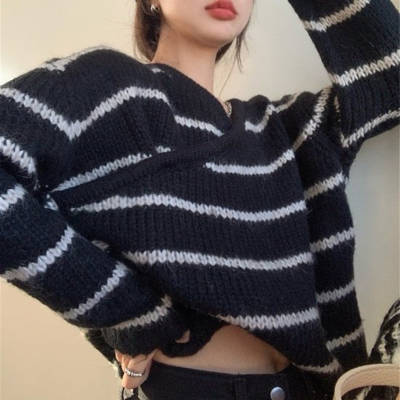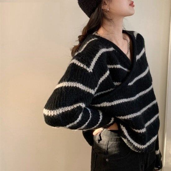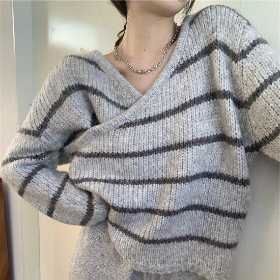 カシュクールニット 長袖 ボーダー レディース 韓国 ファッション セーター Vネック ニット ゆったり オーバーサイズ ドルマンスリーブ ニット セーター 大人カジュアル ボーダーニット グレー 黒