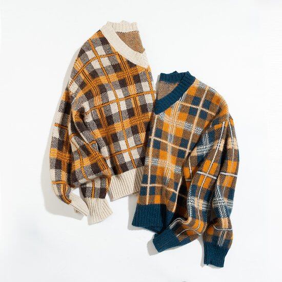 チェック柄のカジュアルなデザインがポイントのニットトップス