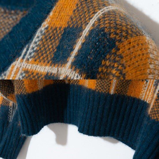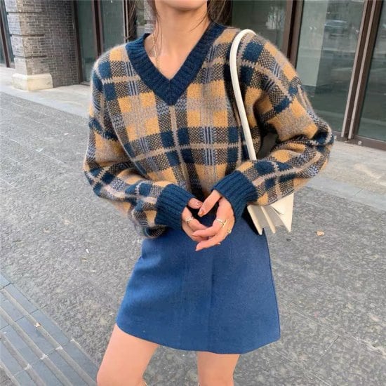 ニット チェック柄 セーター レディース 韓国 ファッション 柄トップス 秋冬 Vネック あたたか 長袖 レトロ おしゃれ ニット セーター チェック柄 大人カジュアル ハイゲージニット 柄ニット