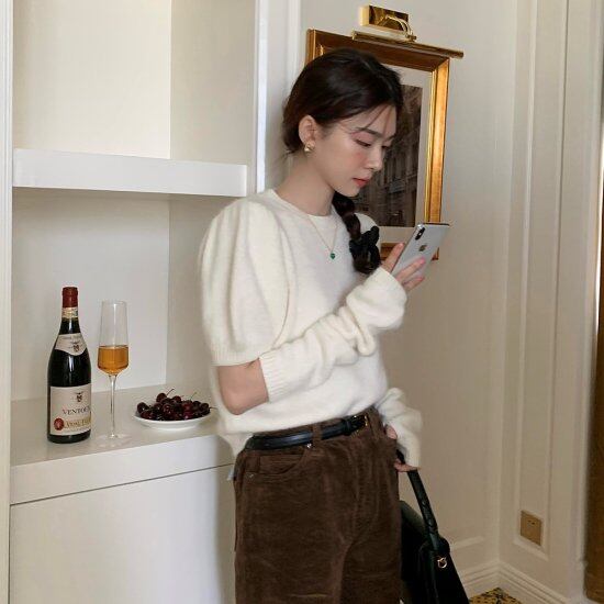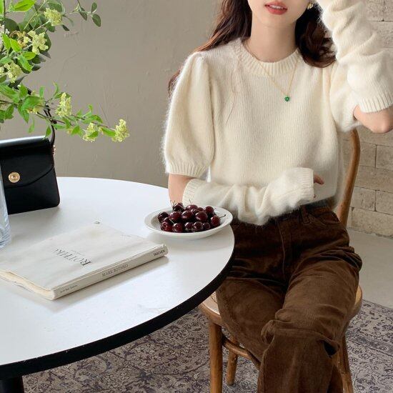 ニット トップス レディース アームカバー 半袖 秋 冬 新作 パフスリーブ 無地 ボリューム袖 ボリュームスリーブ セーター 半そで かわいい コンパクト丈 きれいめ ニット トップス レディース