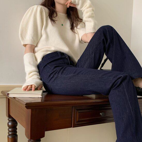 ショート丈とアームカバーが個性的で可愛いニット。
