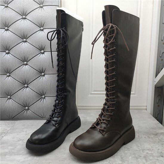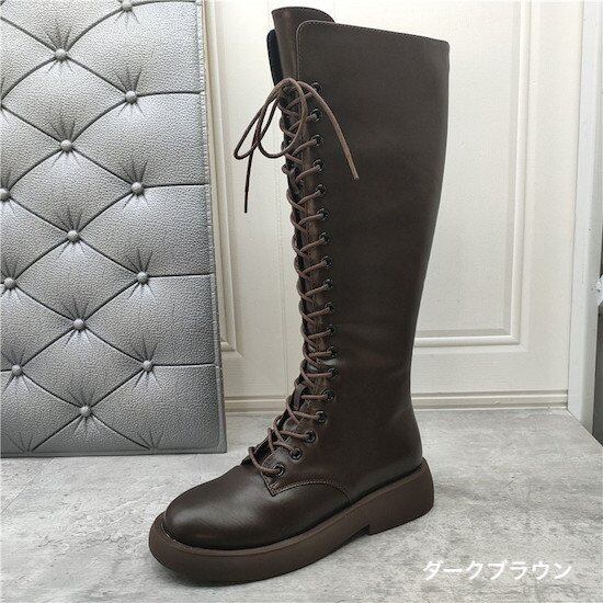 ロングブーツ レディース レースアップ ブーツ ロング 紐 靴 シューズ フラット底 歩きやすい ブラック ブラウン 履きやすい 編み上げ ロングブーツ レディース レースアップ ブーツ ロング 紐