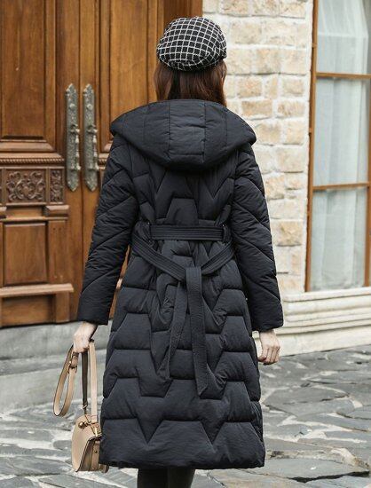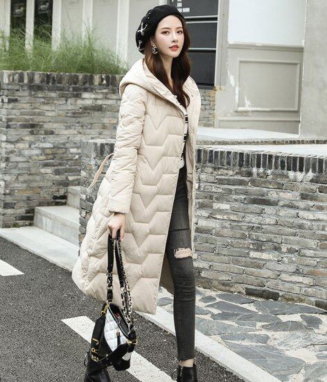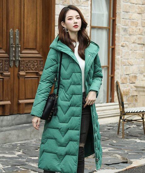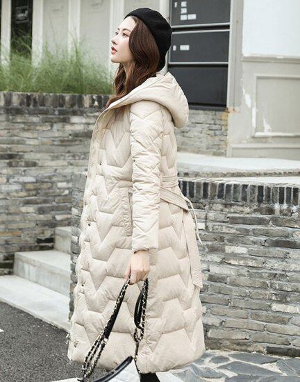 細身で女性らしいシルエットのロング丈ダウンコート。