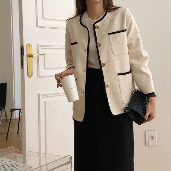 ツイードジャケット ツイード ノーカラー アウター 秋冬 レディース 通勤 きれいめ 上品 モノトーン カジュアル パイピング バイカラー ゴールドボタン ポケット