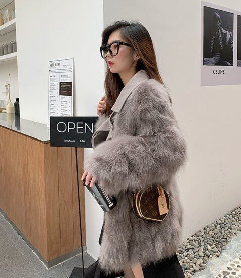 ジャケットとファーコートがドッキングした個性的なファーコート。