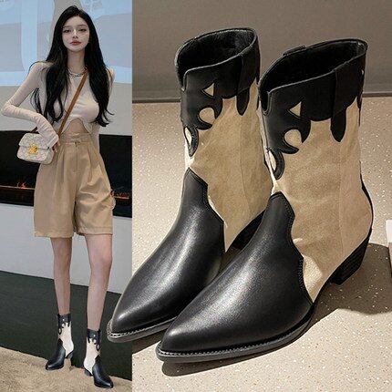 ウエスタンブーツ レディース ブーツ ミドルブーツ ポインテッドトゥ カウボーイ カジュアル おしゃれ ローヒール 太ヒール レトロ 美脚 お出掛け 秋冬 ウエスタンブーツ レディース ブーツ
