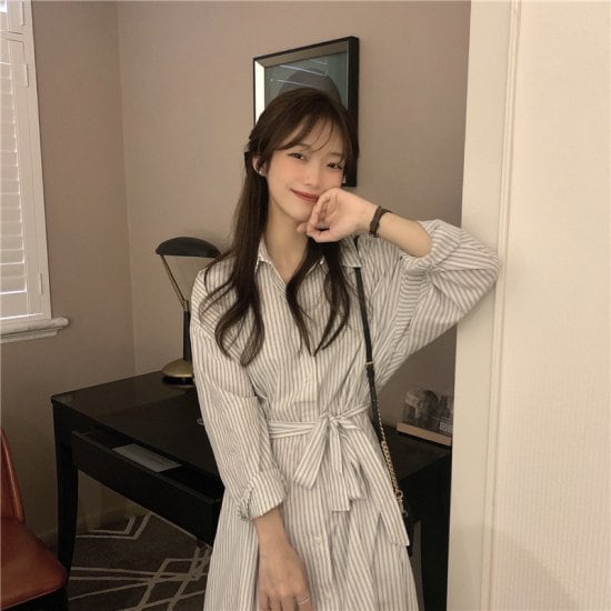 ロングワンピース ブラウス 長袖 シャツ レディース ゆったり シャツワンピース リボン きれいめ チュニック シャツ ロング丈 ストライプ リボンベルト 20代 30代 40代 ゆったり ワンピース