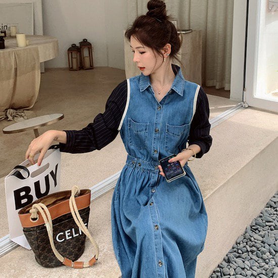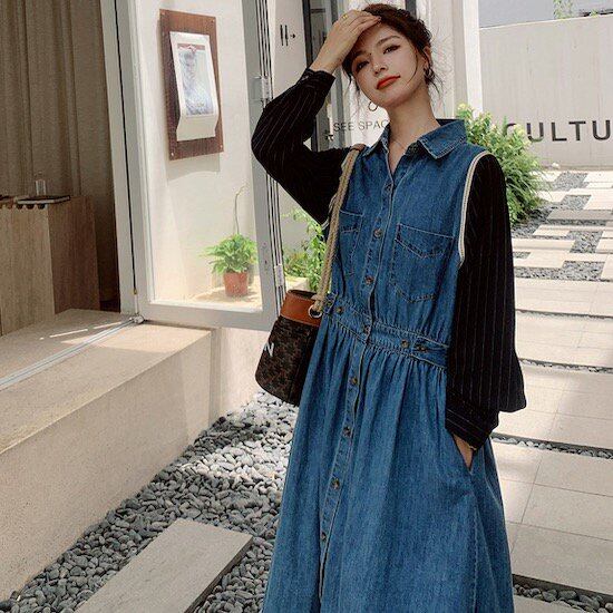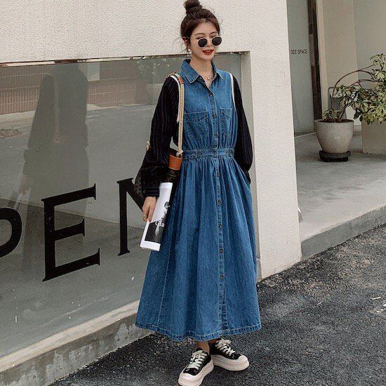 デニムワンピース レディース デニムスカート ロング丈 ワンピース ロングワン ゆったり おしゃれ 春物 秋物 ドッキングワンピ 韓国 デニムワンピース レディース デニムスカート ロング丈 ワンピ