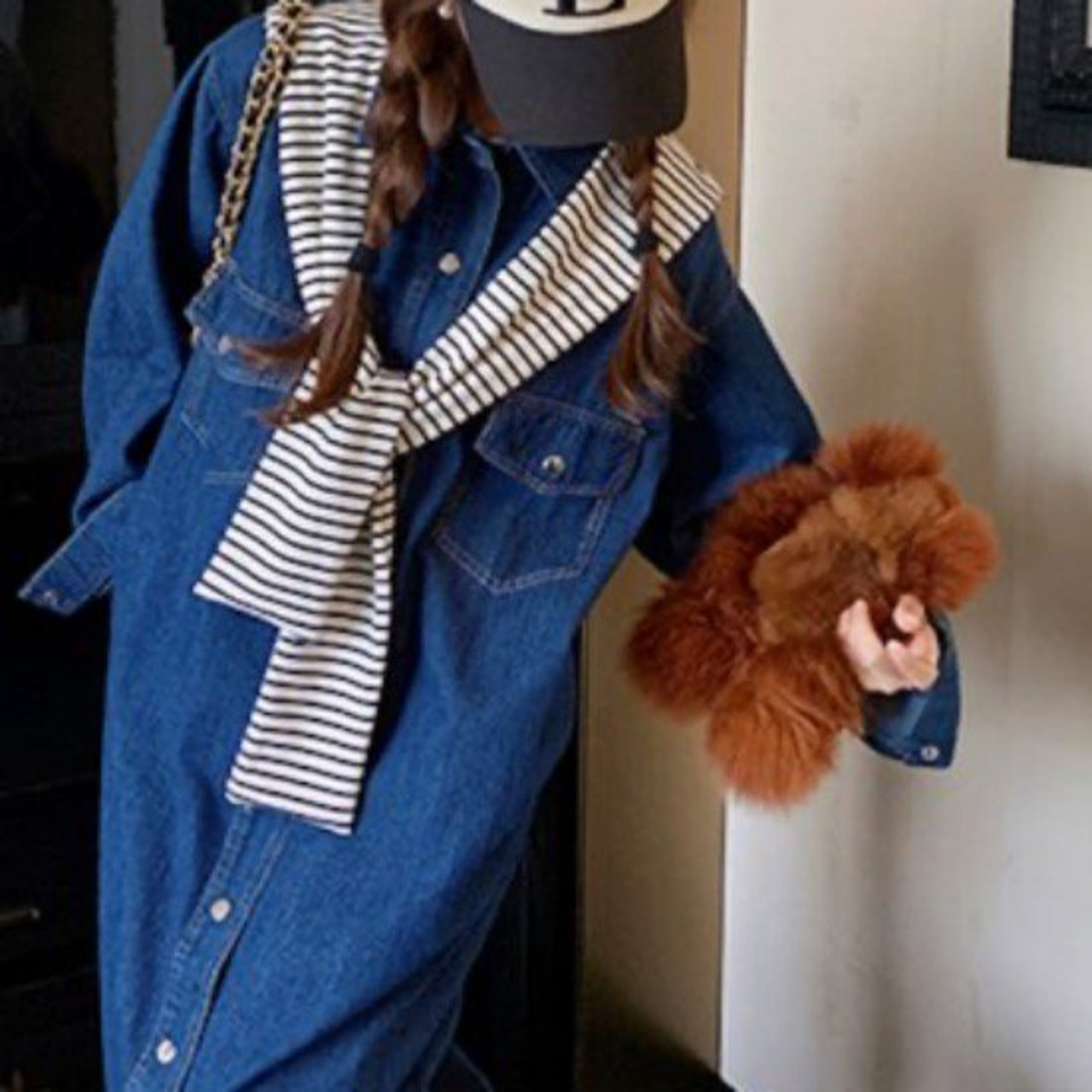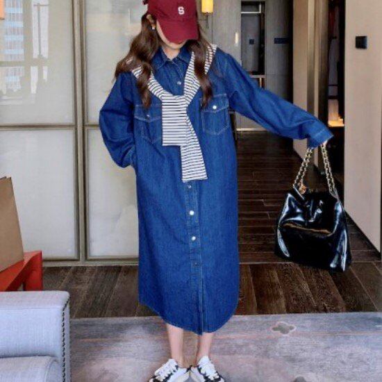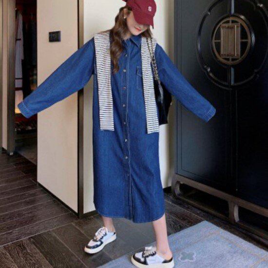 デニムシャツワンピース レディース デニムシャツワンピ デニムワンピ ミディアム丈 ショールデザイン おしゃれ ミモレ丈 長袖 ボタン付き デニムシャツワンピース レディース デニムシャツワンピ