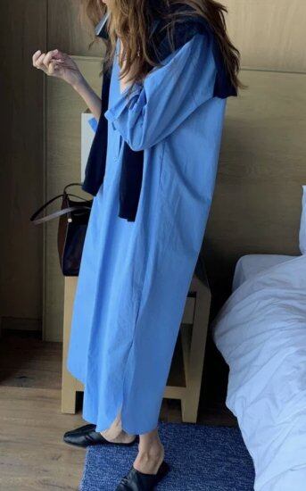 ロングシャツワンピース レディース 長袖 襟付き ミモレ丈 ブルー ゆったり きれいめ デイリー 旅行 シンプル ブルー 無地 カジュアル 上品 ミディワンピース フロントスリット ウエストリボン