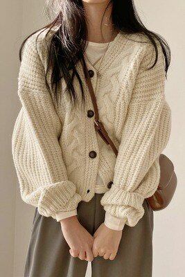 ツイスト編みのデザインがおしゃれなニットカーディガン。
