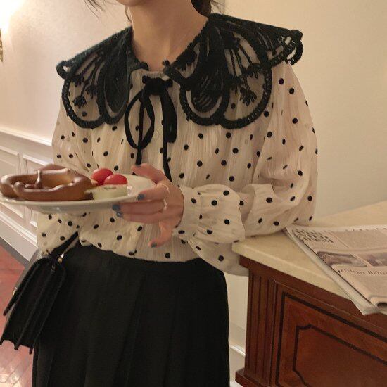 ブラウス レディース トップス ゆったり レース襟 長袖 シャツ ふんわり ビッグカラー ドット かわいい ブラウス レース リボン パフスリーブ おしゃれ 新作 ブラウス レディース トップス