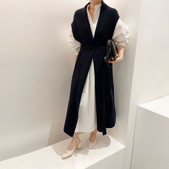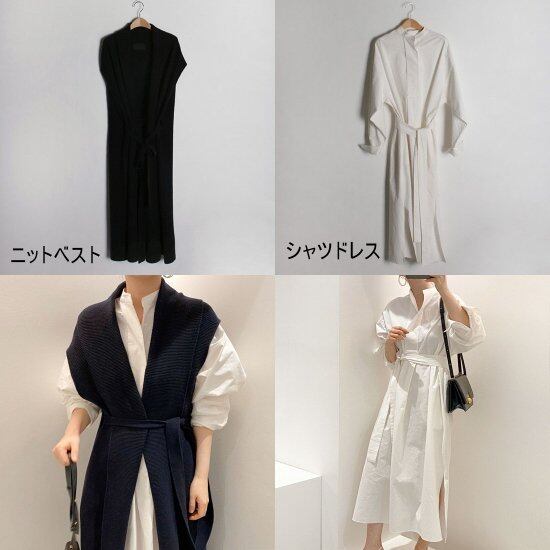 ワンピース1枚でも可愛く、ニットベストと合わせるとスタイリッシュなコーデの完成です。