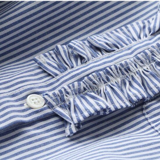 ワンピース ロング丈 長袖 ストライプ シャツワンピース ウエストリボン フリル ワンピース シャツ ブルー かわいい シャツワンピース おしゃれ 大人 ワンピース ロング丈 長袖 ストライプ