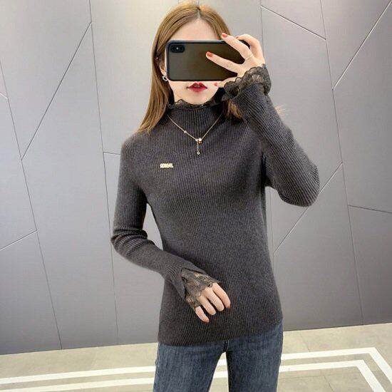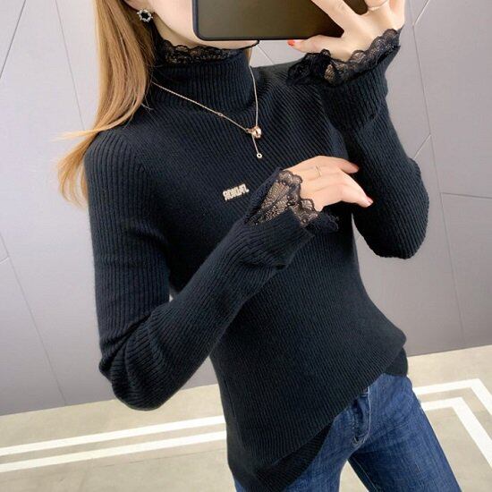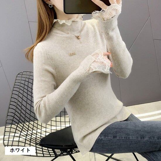 ニット レディース 長袖 レース リブニット レディース ハイネック レース袖 かわいい 大人 トップス ニット スカラップ 3色 きれいめ ニット レディース 長袖 レース リブニット レース袖