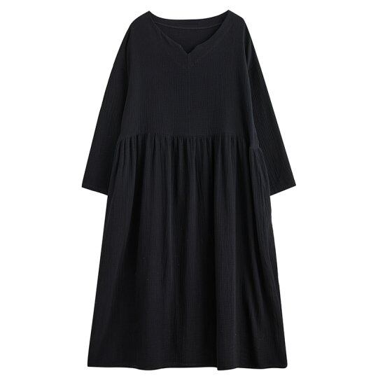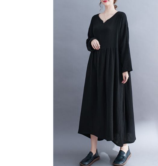 ロングワンピース レディース 長袖ワンピース Vネック シンプル 無地 ゆったり ルーズシルエット カジュアル お出掛け 春秋 コットン 綿 ホワイト ブラック 白 黒 ロングスカート