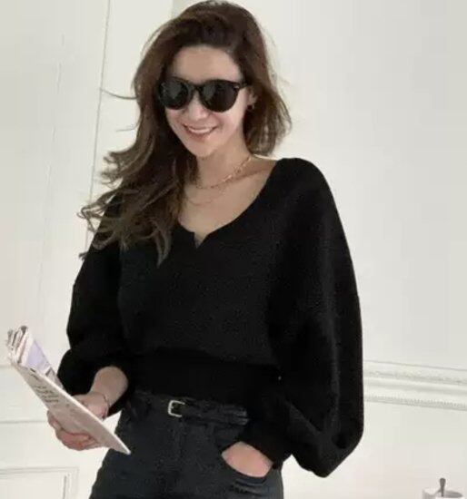 フロントスリットトレーナー トップス スウェット V字カット 長袖 秋冬 レディース シンプル 上品 パフスリーブ クロップド丈 ショート丈 無地 ボリュームスリーブ カジュアル ウエストマーク